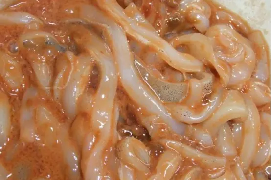 鹽辛是一道日本菜,常選用長條的烏賊或者魷魚,掏出內臟,把它們切成細條或細絲。再把掏出的內臟則抹上鹽,風乾一夜後將搗成肉泥,混合之前的細條細絲一起攪拌,最後加入墨魚汁封口發酵。鹽辛的顏色接近皮膚的肉色,一碗鹽辛放在眼前,條狀的粘稠物盤根錯節在一起,讓它從視覺上就有一種詭異感。