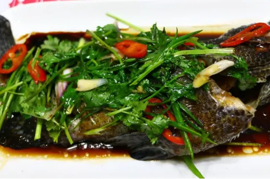 (圖為桂花魚) 來個特寫。 鋪好蔥絲,香菜後,就可以用蒸魚豉油。聽說李X記不錯,我也覺得不錯。至於要倒多少量?我覺得,首先得看魚有多大,其次,不是越多越好,健康為先。對了,喜歡吃辣的同學,可以切一些紅椒圈鋪在面上。