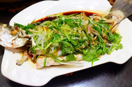 (圖為桂花魚) 然後啊,就把蔥絲,香菜(當然得洗乾淨切好啊)均勻鋪排在魚的面上。對於不喜歡吃蔥和香菜的沒關係,只要你不夾就好啦。