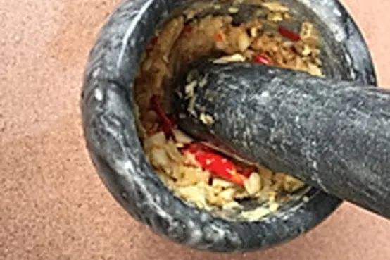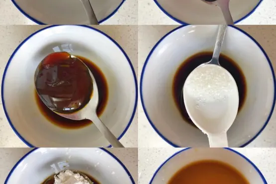 攪拌好的汁倒入大碗裏和搗碎的薑蒜辣椒末一起攪拌均勻,醃蟹的汁就調好了