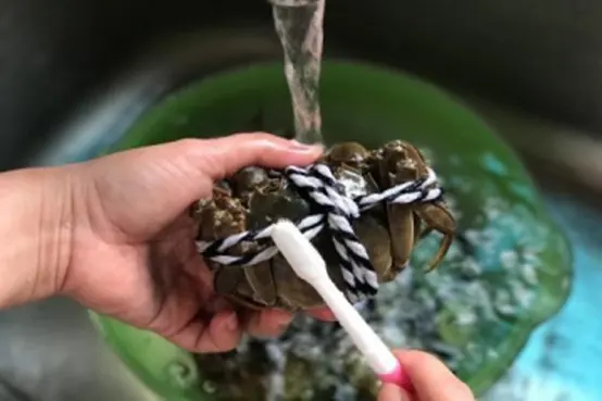 洗螃蟹,繩子先不要急著拆,一只只用流動的水,沖刷乾淨後,再拆線備用!