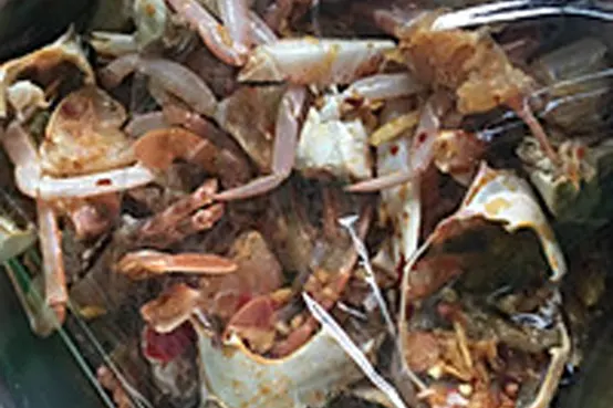 把調好醬汁倒入螃蟹上,用筷子攪拌一下,讓每一塊都蟹肉都沾上醬汁