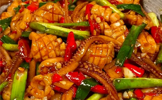 • 加入魷魚須和芹菜,炒大概兩分鐘後,加入料酒翻炒均勻,最後加入少許生抽和白糖,翻炒均勻出鍋。